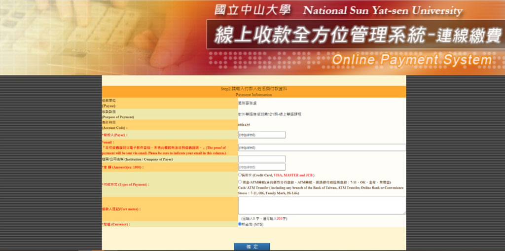 Cash/ ATM Transfer ( including any branch of the Bank of Taiwan, ATM Transfer, Online Bank or Convenience Stores:7-11, OK, Family Mark, Hi-Life )